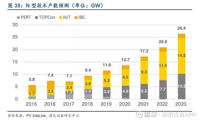 目前全球HIT電池規劃產能已超15GW,但實際產能在3-4GW左右。根據PV InfoLink預測,預計到2023年N型電池產能將達到26.4GW,而HIT電池產能將達到14.5GW,相比2018年HIT 產能提升約4倍。
