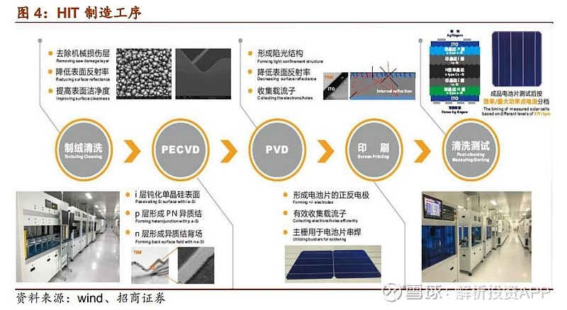 HIT電池主要生產工序有4步,對應4種專業設備,依次是清洗制絨機、PECVD、PVD/RPD、絲網印刷機。具體來看,