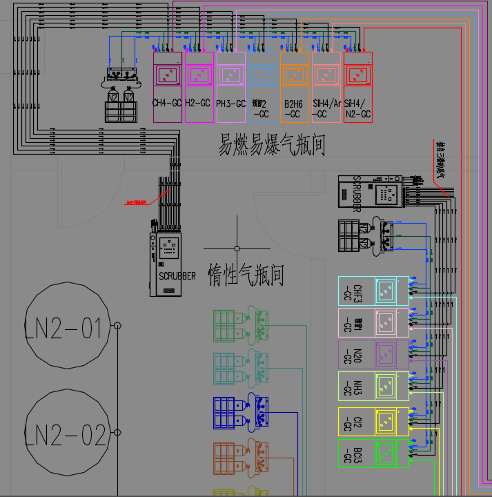 特氣系統(tǒng),尤其是集中供氣系統(tǒng)引入國內(nèi)的時間并不長,相應(yīng)的設(shè)備、施工方法、經(jīng)驗多是從歐美等發(fā)達(dá)國家延伸而來。我們可以參考美國ASTM給出的相應(yīng)標(biāo)準(zhǔn),目前國內(nèi)標(biāo)準(zhǔn)也在逐步完善當(dāng)中。隨著半導(dǎo)體行業(yè)如火如荼的發(fā)展,越來越多的特氣設(shè)備也引入我們自己的生產(chǎn)線中,在多設(shè)備引入時建議不相容GR應(yīng)布置在不同房間里,當(dāng)由于條件所限布置在同一房間時,GR之間的距離應(yīng)大于6M。同時具有可燃性和毒性的氣體設(shè)備應(yīng)該放置在可燃性氣體間。GR、GC、Scrubber等設(shè)備宜靠墻布置,具有相同性質(zhì)的設(shè)備應(yīng)該布置在一起。特種氣體房間內(nèi)的中間通道寬度不得小于2M。GC與墻體之間的距離宜大于0.1M,GC之間距離宜大于0.1M。各類設(shè)備布置應(yīng)該預(yù)留維修和運(yùn)轉(zhuǎn)空間。長管拖車、ISO標(biāo)準(zhǔn)集裝瓶組等大型設(shè)備宜放置在室外空曠平地。